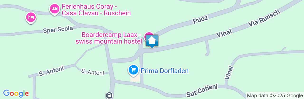 Vom Skigebiet (Crap Masegn) führt eine Talabfahrt zum Boardercamp-Hostel nach Ruschein; der Shuttlebus zur Talstation Laax (100 m) ist gratis. Supermarkt in unmittelbarer Nähe; Restaurant im Hostel (Kneipe/Beiz im Sommer), Frühstück und Abendessen ist im Preis inbegriffen, Parkplätze und Wifi gratis, Pauschalangebote inkl. Skipass auf Anfrage oder auf unserer Website https://www.boardercamp.com